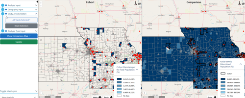 By using the geocoded data produced by GeoMarker, SCALE can create visualizations of patient cohorts and social determinants with side-by-side mapping, including information like the child opportunity index, race and ethnicity details, income data and more. The tool can also automatically generate a summary table of cohort data alongside publicly available data for those indicators, giving researchers a more accurate view into how well-represented the various demographic groups are in their own data sets. Users can toggle layers on and off, change colors on the map, export visuals and more.